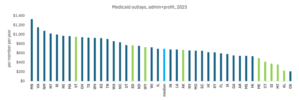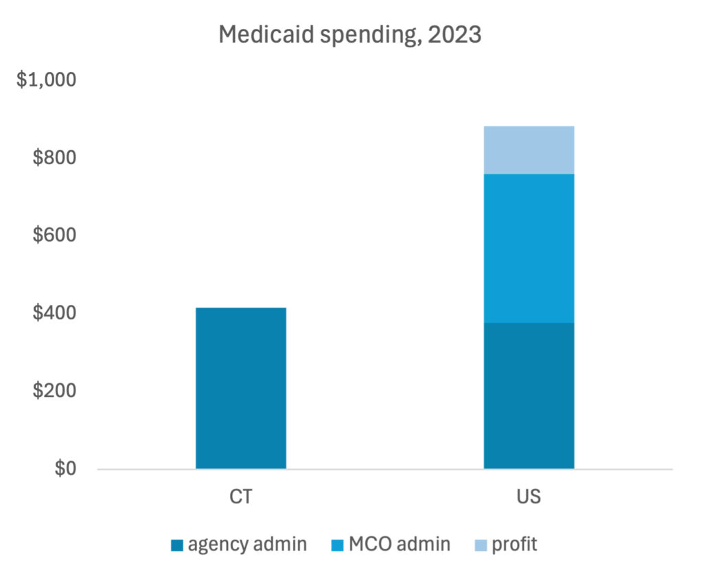 Note: The researchers also evaluated administrative costs for self-funded plans. Nationally, those costs are about half what they are in either Medicaid or fully-funded plans. Unfortunately, they didn’t have data on Connecticut’s self-funded plan administrative costs.