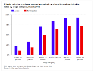 Only 22% of Americas earning the lowest ten percent of wages are offered medical benefits by their employer, according to a new report by the Bureau of Labor Statistics. This compares with 93% of the top ten percent of earners who are offered medical benefits at work. Unfortunately, the lowest wage workers also pay more for their benefits and employers pay less. Workers with wages in the lowest ten percent pay almost $125 more per month for family coverage than workers with wages in the top ten percent. Not surprisingly, even the lower wage workers who are offered benefits are less likely to accept them. Only 11% of workers with wages in lowest ten percent of Americans participate in employer-sponsored coverage, compared to 72% of those in the highest ten percent of wages. Employer offers of dental and vision benefits are lower than medical benefits among all workers, but the disparity between high and low wage earners is also reflected there. Low wage workers are also less likely to be offered retirement, paid leave, paid vacation, and paid holiday benefits, according to the BLS.