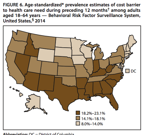 A new report from the CDC provides the first analysis of the population-based impact of the Affordable Care Act. The analysis used data from the 2014 Behavioral Risk Factor Surveillance System, a state-based ongoing survey of adult Americans about health risk behaviors, chronic conditions, health care access and use of preventive care. As for previous studies, this study found that challenges to accessing care are highest for adults with less than a high school education, are unmarried, unemployed, racial/ethnic minorities and people living in poverty. Adjusting for age differences, the study found a sizeable difference between states that chose to expand Medicaid and those that did not for health coverage (85.3% vs. 79.1%, respectively), having a usual source of care (73.8% vs. 69.7%), and experiencing a cost barrier to receiving needed care (15.3% vs. 18.5%). Interestingly there was almost no difference in the age-adjusted rate of having had a routine check up in the last year (65.0% vs. 64.9%). The report also compares rates of preventive care, cancer screenings and specific cost barriers by income level, region of the country, and type of coverage. For example, 27.8% of uninsured American adults reported that they had to pay off medical bills over time in 2014 while only 21.9% of people with public coverage and 22.1% of privately insured Americans faced that barrier. About half as many uninsured American adults received flu vaccines in 2014 (18.0%) than those with public (37.4%) or private (36.7%) coverage. Connecticut compares well in most categories with the rest of the nation.